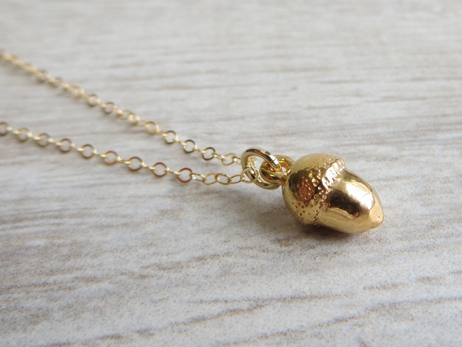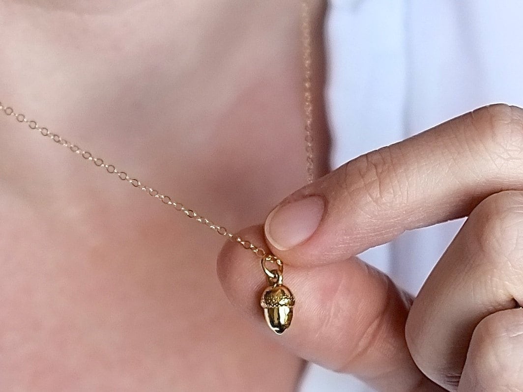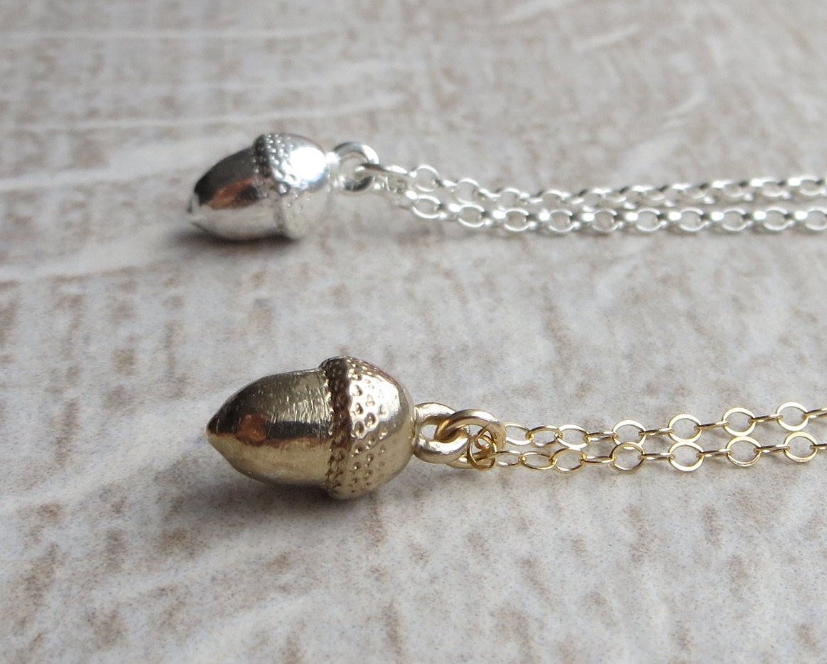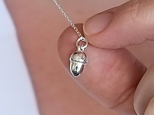 This beautiful handmade baby acorn charm necklace is available in solid sterling silver or 18 carat gold plated bronze.
