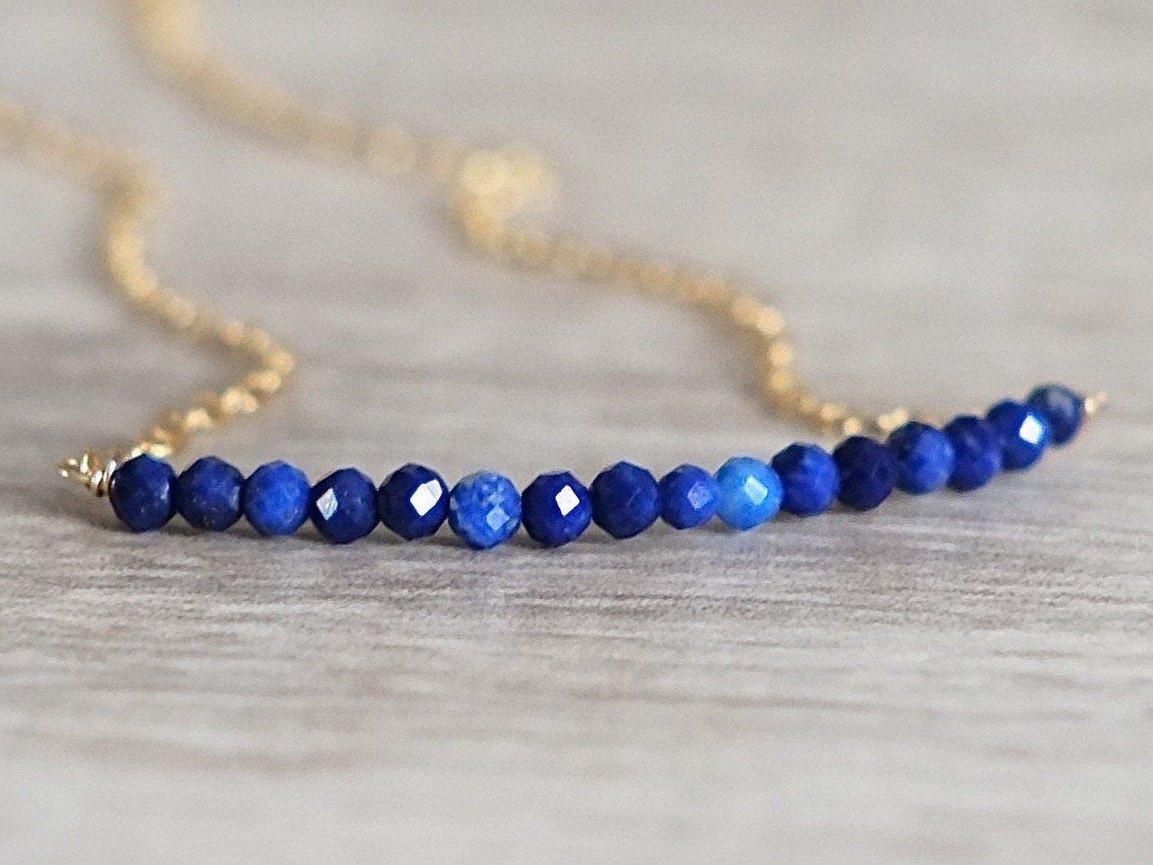 This beautifully hand made tiny real hand cut Lapis lazuli gemstone necklace is made using a sterling silver or 14 carat gold filled chain.